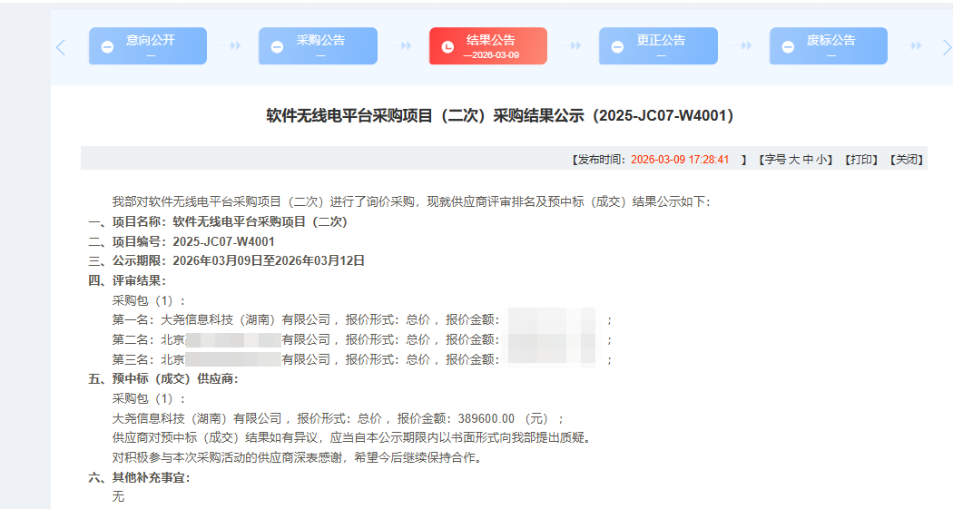 本次采购项目由采购方通过询价方式开展,经过严格的评审流程,对各参与供应商的综合实力、技术方案、产品质量及报价等多方面进行全面考核。大尧信息凭借多年在软件无线电领域的技术积淀、丰富的项目经验以及符合项目需求的优质解决方案,在众多竞争对手中表现突出,荣获评审第一名,成功成为本次项目的预中标(成交)供应商。